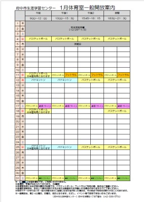 1月体育室一般開放案内