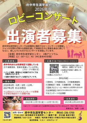 府中市生涯学習センターでは、センター1階にあるアトリウムにてロビーコンサートを開催しております。